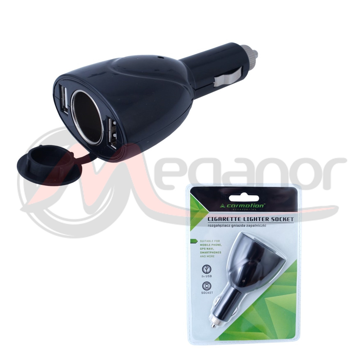 Adaptador conectado à tomada do isqueiro. Equipado com duas entradas USB adicionais e uma tomada EURO. Projetado para instalação em automóveis com alimentação de 12V e 24V.