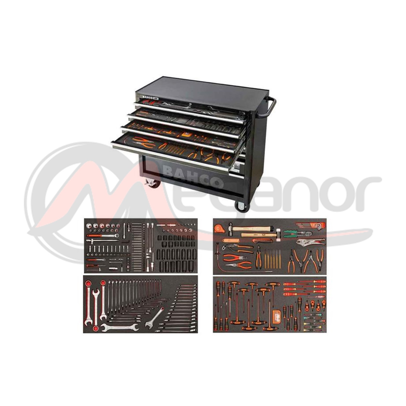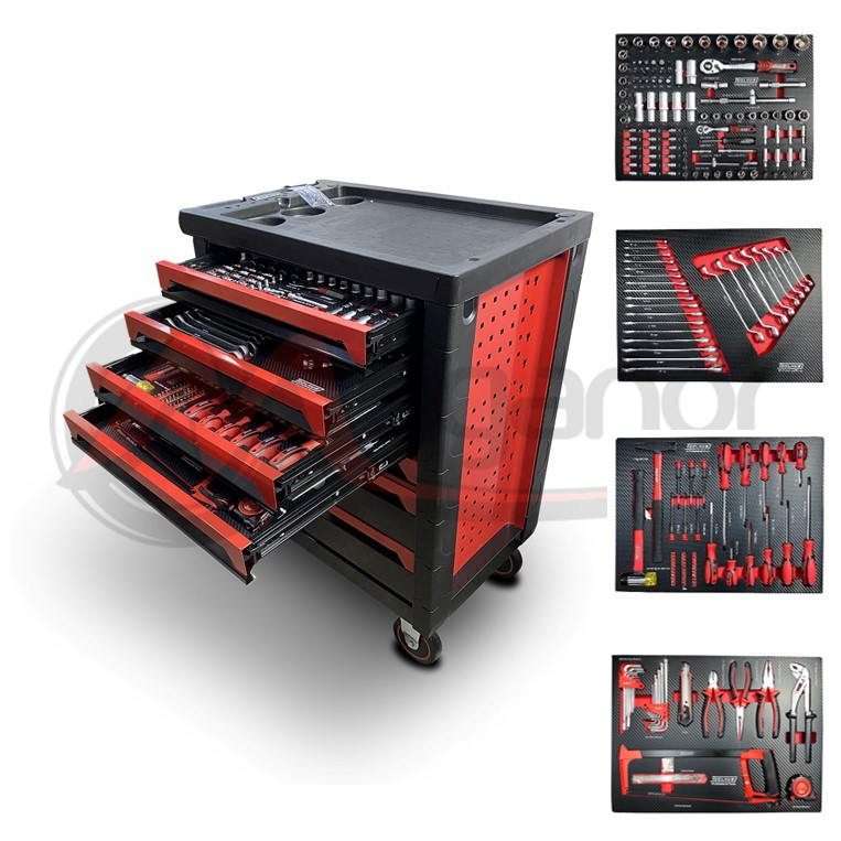 - Carro de ferramentas com 6 gavetas, equipado com 216 peças organizadas em módulos de espuma, ideal para uso profissional.