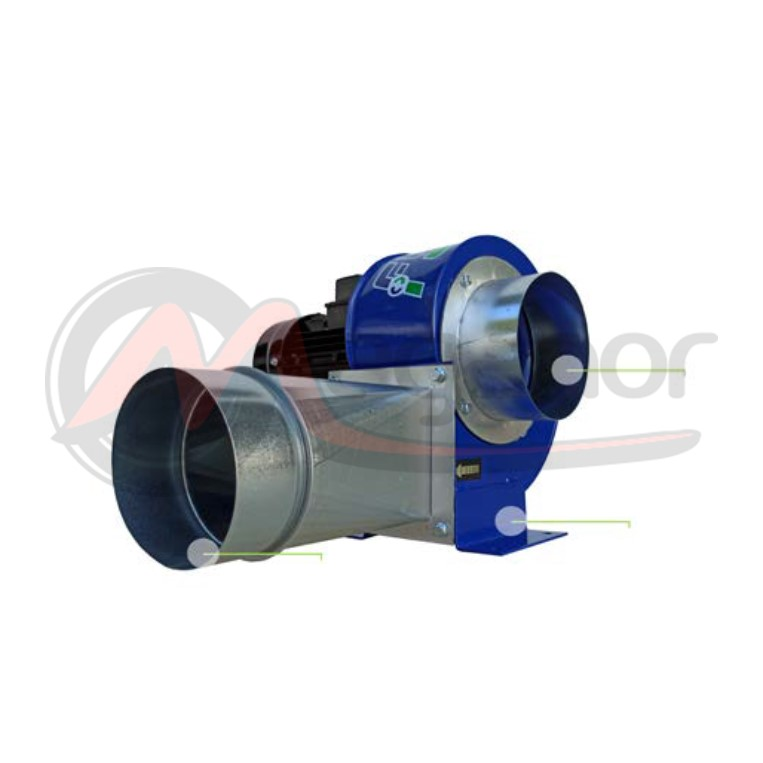 Aspirador trifásico 220/380V 1,5 HP. Inclui suporte de montagem e ligações de entrada e saída em aço inoxidável. Caudal de ar: 1.950 m³/h.