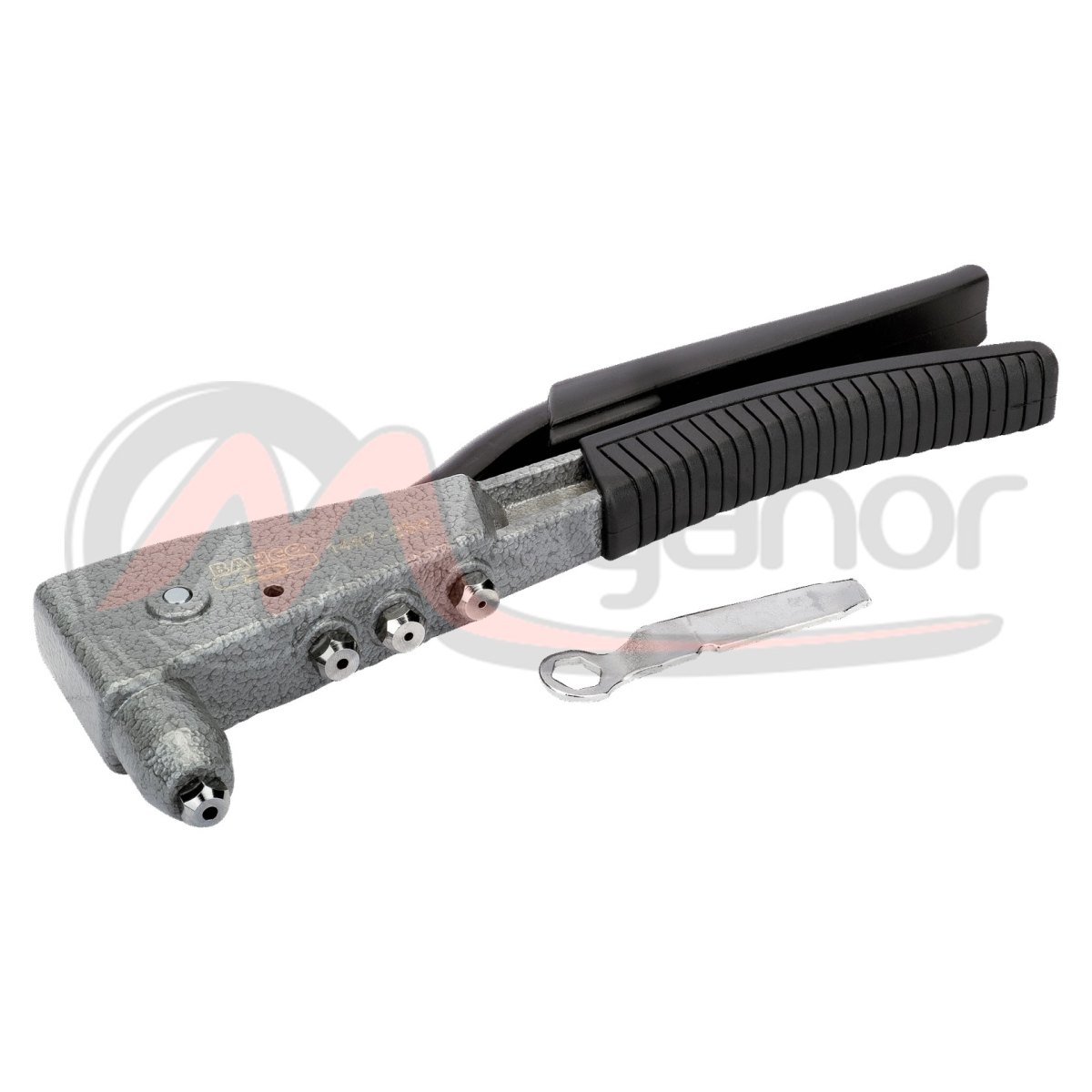 Rebitador de trabalho geral com quatro cabeças permutáveis para capacidades de rebitar de 2,4 mm, 3,2 mm, 4,0 mm e 4,8 mm|Inclui uma chave para trocar as cabeças