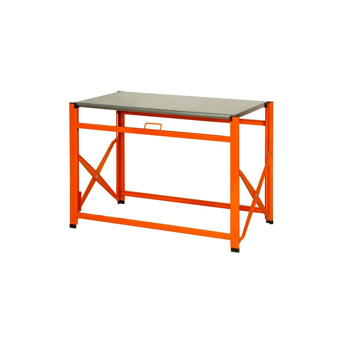 Sistema de tesoura de dobragem resistente|Topo galvanizado de 30 mm de altura|Superfície de trabalho de 970/1200x500x30 mm|Espaço de armazenamento superior específico para torná-lo muito compacto|Pegas suaves confortáveis para o utilizador|Tampas de plástico antideslizantes nos pés|Capacidade de carga: 300 kg
