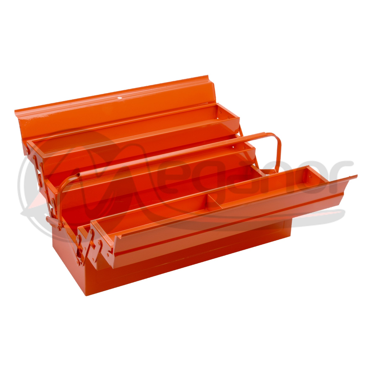 Caixa de ferramentas estilo consola|Pega dobrável para armazenamento compacto|Ao puxar pela pega, a caixa abre facilmente, permitindo o acesso imediato a todos os compartimentos de ferramentas|3140N com 3 compartimentos|3141N com 5 compartimentos|3149 com 5 compartimentos|3149-OR com 5 compartimentos
