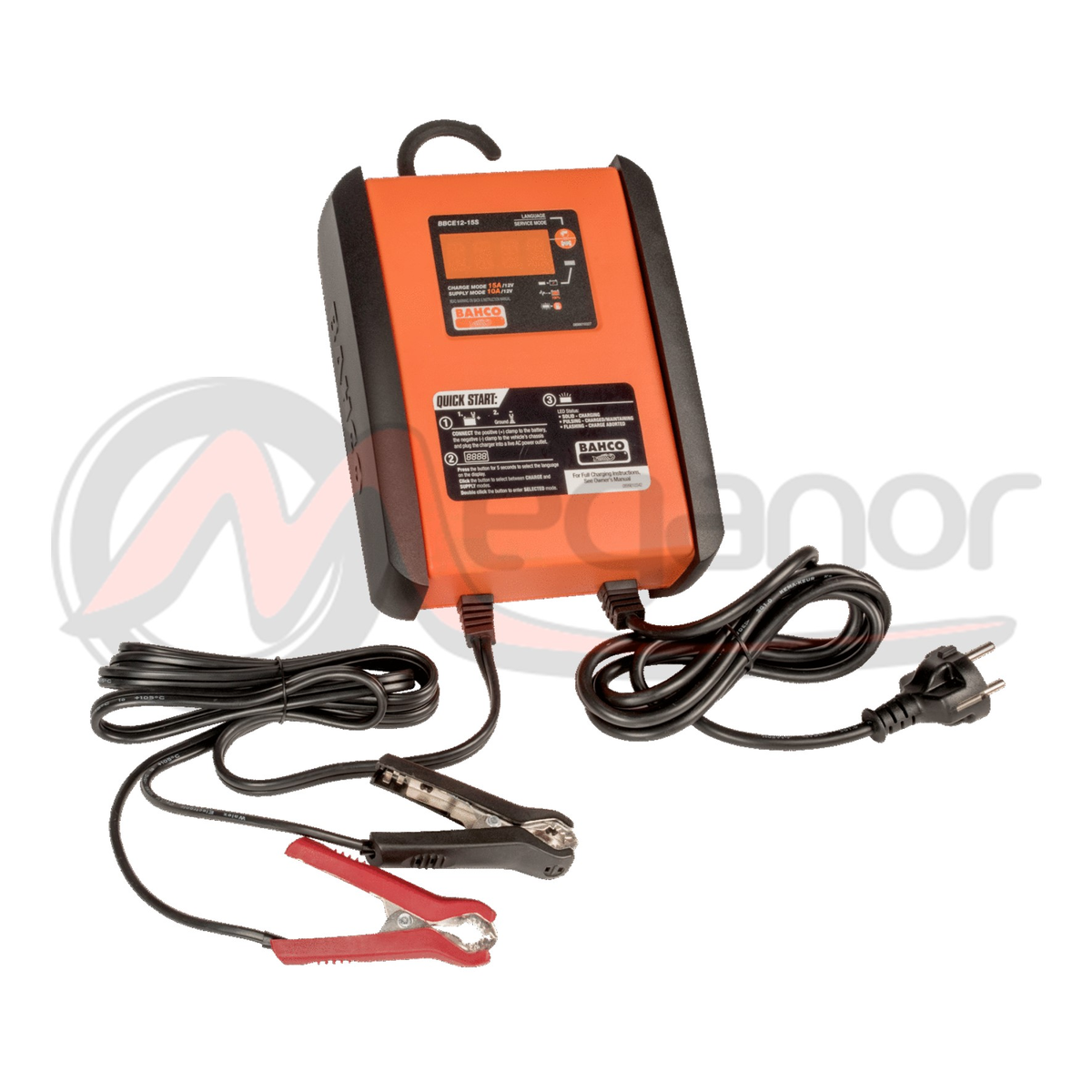 Conteúdo da caixa: Carregador/reparador de 15 A/10 A 12 V com modo de alimentação, adaptador de grampo, arnês de cabos de anel fundido e manual do utilizador