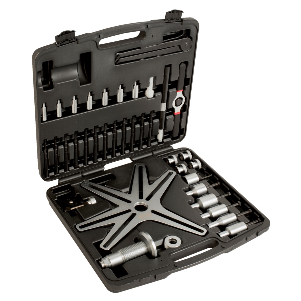 Permite centrar adequadamente e com precisão ao desmontar e montar embraiagens (SAC)|Adequada para SAC padrão, mas também para embraiagens não SAC, para uma vasta gama de veículos|Inclui 6 mandris de centragem, especialmente concebidos para embraiagens BMW, onde a tampa da embraiagem é montada com um dispositivo de bloqueio temporário|Esta estrutura de fixação é perfeita para tampas de embraiagem de 6 e de 8 parafusos, tendo sido concebida com aberturas para a aplicação de 3 e 4 parafusos|Evita danificar a placa de pressão|A estrutura de fixação de seis braços proporciona leveza e flexibilidade|Adequado para veículos comerciais ligeiros e de passageiros comuns, estando incluídos mandris de centragem com os seguintes diâmetros: 12, 14, 15, 16, 17, 18 e 19 mm|Para veículos BMW, estão incluídos mandris de centragem com os seguintes diâmetros: 23, 26,5, 28, 32,5, 32,5 (para eixo de rolamento piloto) e 34 mm|Ferramenta de reposição incluída no conjunto|Liga de aço de alto desempenho|Acabamento cromado e niquelado|Instruções de funcionamento incluídas|Fornecido numa caixa moldada por sopro para melhor gestão das ferramentas
