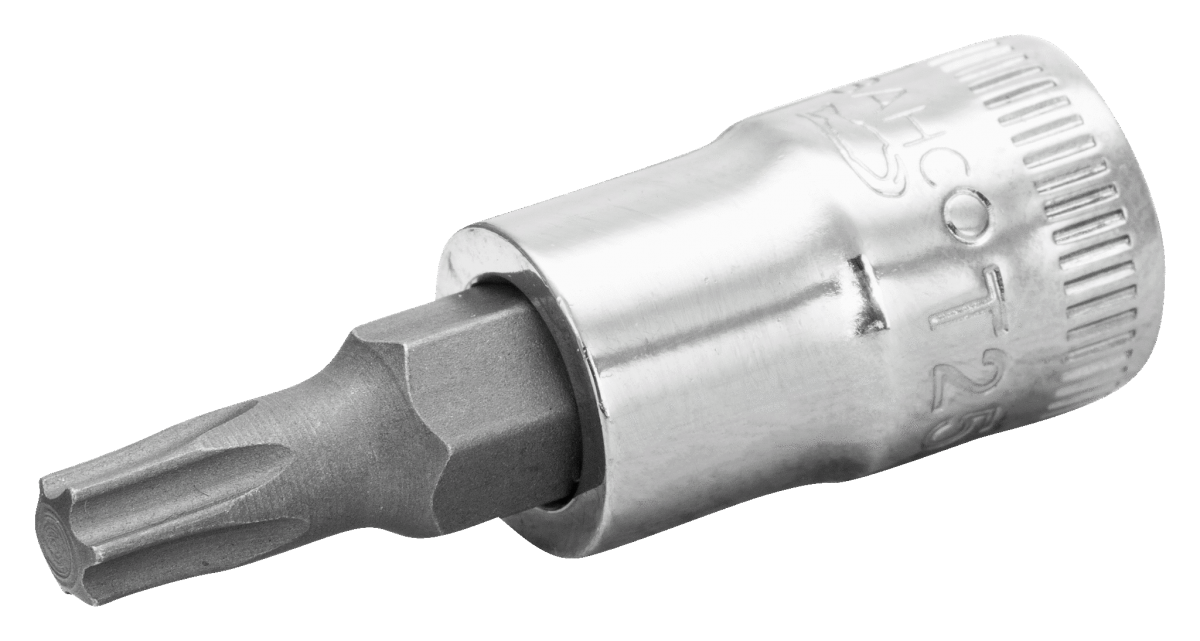 Roquete quadrado de 1/4\", para parafusos TORX®|Não recomendado para operações em máquinas|Liga de aço de alto desempenho|Acabamento de polimento fino|Estriado|ISO 1174|DIN 3120