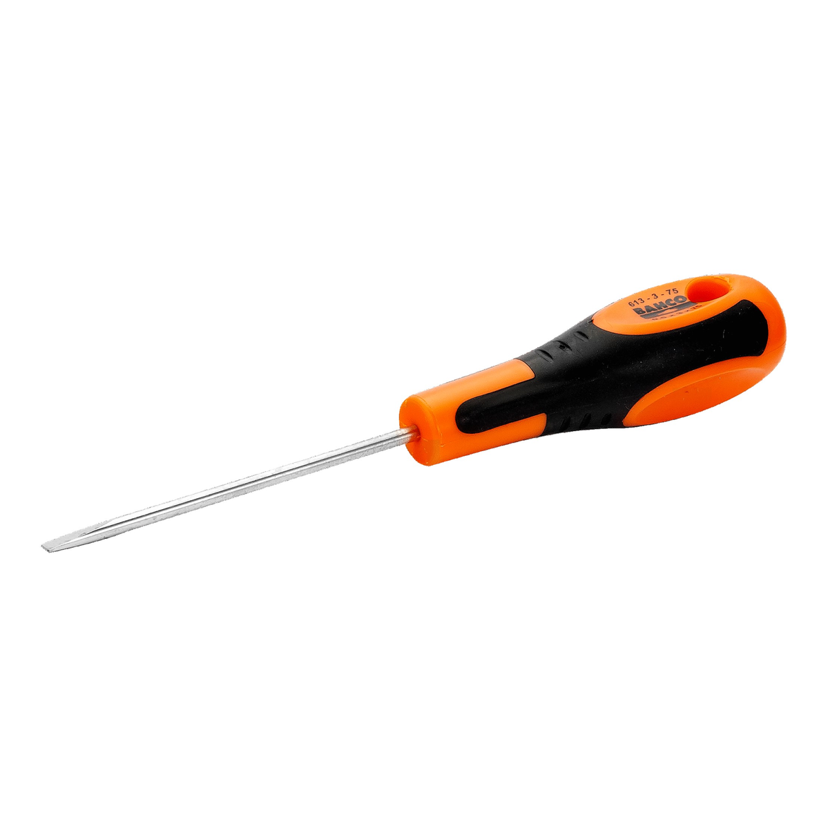 Chave para parafusos de fenda|Cabo: cabo em 2 componentes com furo para pendurar. Ligação cabo-lâmina perfeita|Lâmina: aço de elevada qualidade. Niquelada e inteiramente endurecida|Marcação: o tamanho e número de peça estão assinalados no cabo|ISO 2380/DIN 5264