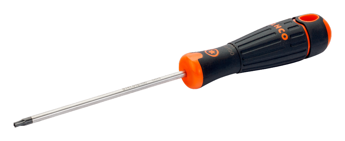 Chave para parafusos TORX® resistentes a violação|Cabo: cabo em 2 componentes com sulcos verticais para uma preensão confortável e transmissão de força máxima. Superfície antiderrapante|Lâmina: liga de aço de alto desempenho. Cromada e inteiramente endurecida. Ponta com acabamento em preto para maior precisão|Marcação: número de peça e tamanho de ponta marcados a laser para fácil identificação|SB = Embalagem individual