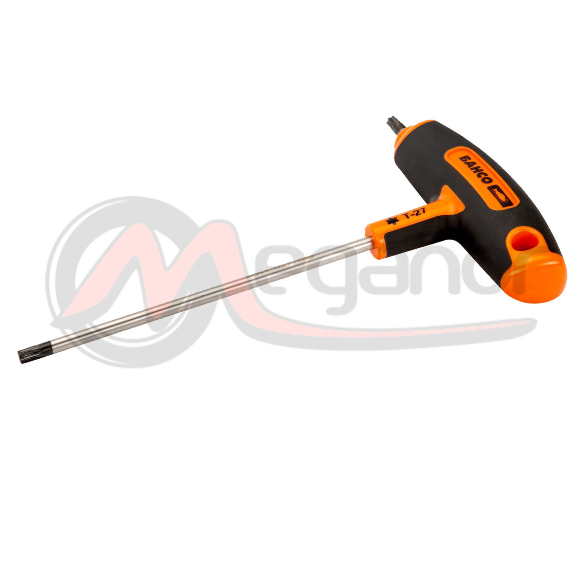 Chave de parafusos com cabo em T para parafusos TORX®|Cabo: o cabo em 2 componentes suave proporciona conforto adicional e reduz o número de pontos de pressão na mão|Lâmina: aço de elevada qualidade. Cromada e inteiramente endurecida. Ponta com acabamento em preto para maior precisão|A lâmina longa permite a aplicação de um torque controlado e proporciona acesso fácil a parafusos em profundidade|A lâmina curta de 90° é utilizada para torque extremo, ou para trabalhos em áreas de altura limitada|Marcação: tamanho e número de peça com marcação a laser na lâmina para fácil identificação