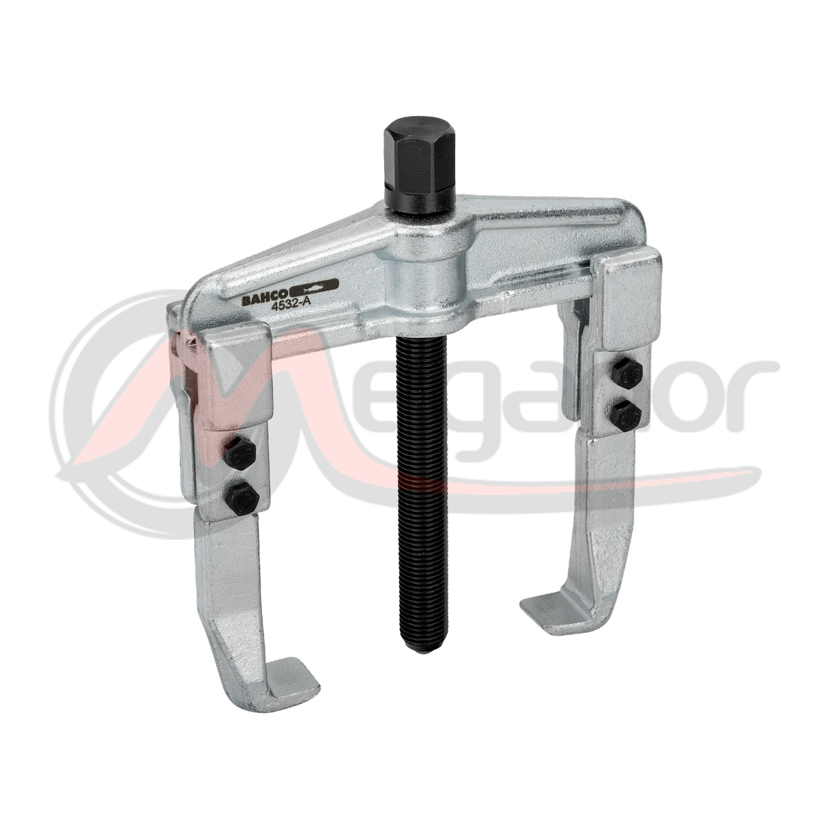 Extrator: 2 braços|Acabamento: galvanizado, com eixo endurecido por indução de 4532-C, D, E, F, G e H|Braços e garfos matrizados|Material: aço especial|Ao inverter a posição dos braços, o extrator pode ser utilizado para interior ou exterior|As grandes superfícies de garra oferecem muitas vantagens para a remoção cuidadosa e rápida de polias, engrenagens, rolamentos de esferas, etc.|Os braços apertam sempre paralelos um ao outro|4532K: par de braços de substituição|4532LK: par de braços longos de substituição|4532/S: fuso de substituição