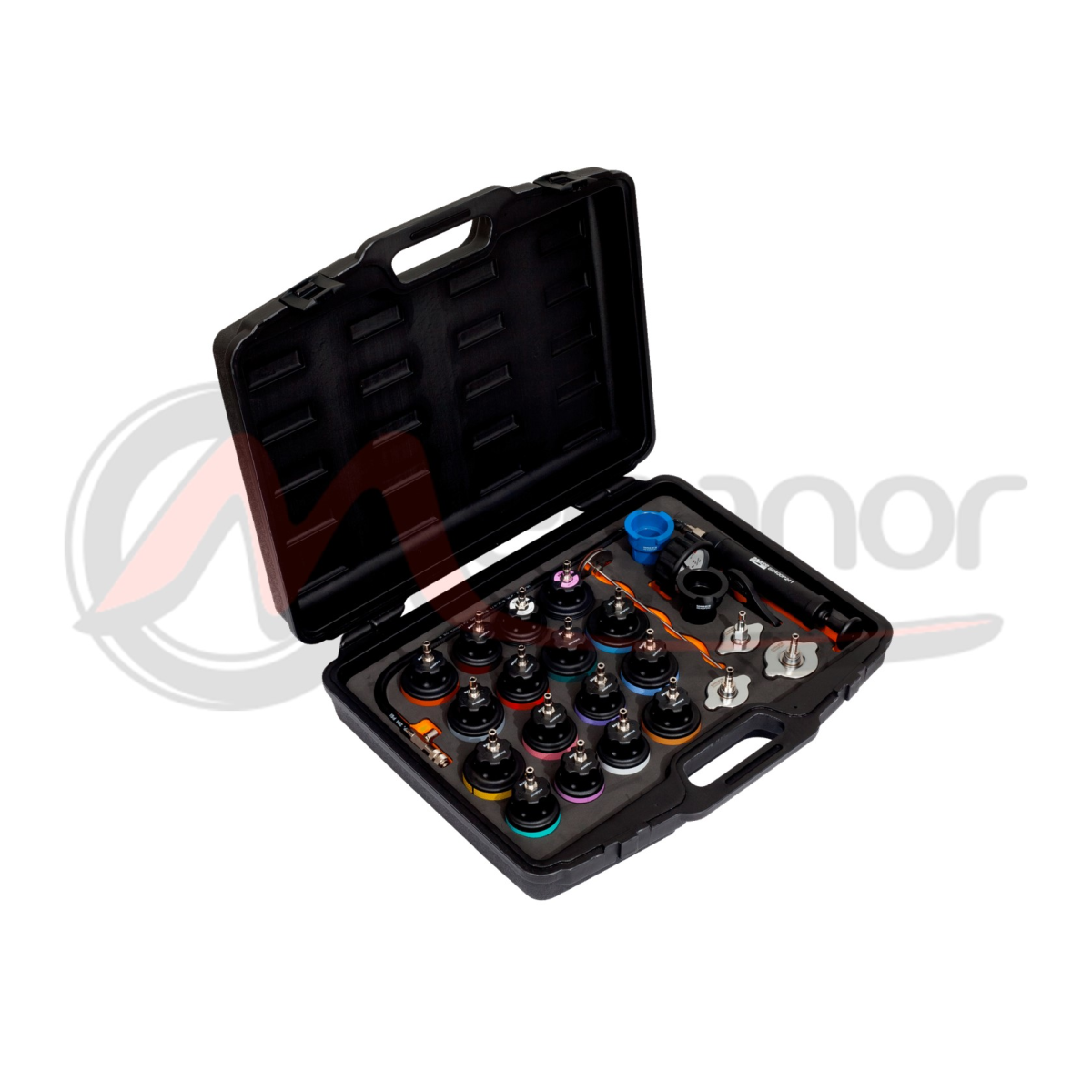 Aplicação: permite verificar se existem fugas no sistema de arrefecimento numa vasta gama de motores, de forma rápida e simples|Conteúdo:|Bomba de teste de pressão com calibrador [0-2,5 bar/0-350 psi] e acoplamento rápido|Termómetro (0 - 200 °C)|16 adaptadores ABS com código de cor|1 chave ABS para aperto de adaptador|3 adaptadores metálicos|2 adaptadores universais de teste de tampão de automóvel|Ampla cobertura universal [consultar a tabela de aplicações]|Operação: inserir pressão no sistema|Se a pressão se mantiver, não existe fuga|Se a pressão se perder, existe uma fuga|Todos os componentes têm acoplamentos rápidos para uma maior segurança e tempo de operação reduzido|Fornecido numa caixa em molde de sopro, em módulo de espuma para um melhor controlo de ferramentas
