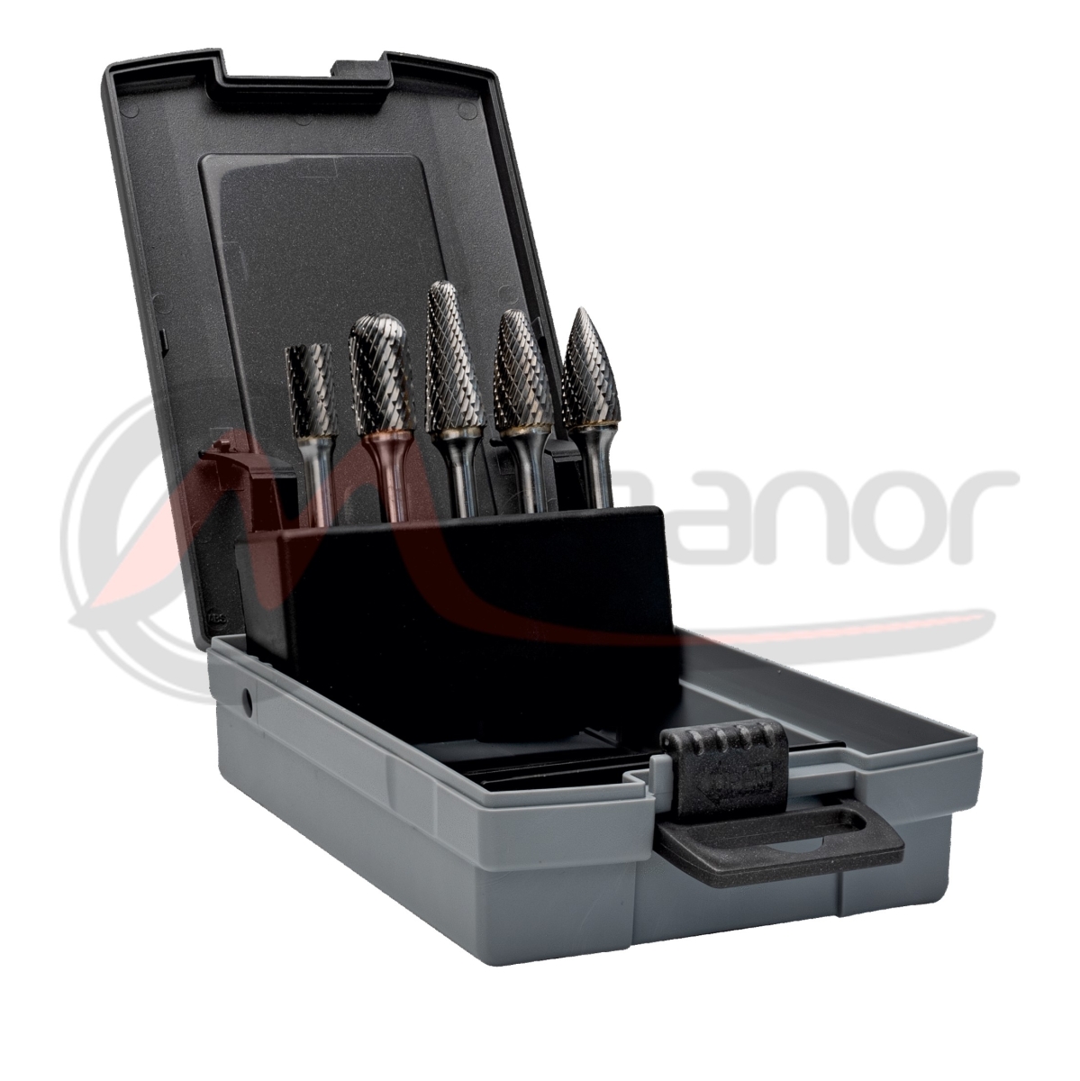 Conjunto universal de 5 peças com as formas populares, com o cinzelado fino e um estilo de corte X mais fácil de usar / Remoção rápida de material num amplo espectro de materiais como aços, cobre, ferro fundido e ligas de níquel / Rebarbação de extremidades e diferentes superfícies / Ferramenta indispensável, usada num grande número de setores industriais, tais como aeroespacial, automóvel, ferroviário, marítimo, fundições, molde e bolor, geração de energia, petróleo e gás, etc. / Utilizado para depurar objectos irregulares ou para concluir o trabalho de acabamento dentro de um espaço confinado / O número de dentes também está indicado para além do tipo de corte para cada broca rotativa / Tipo de corte: M = Médio com corte duplo / Normalmente em stock: X = sim
