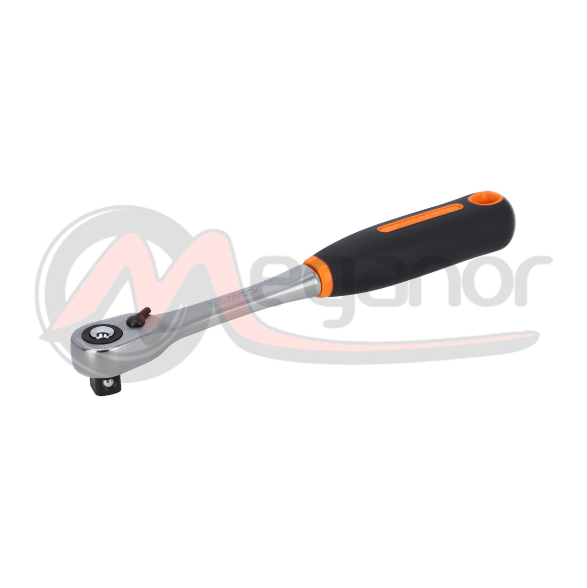 Roquete de 1/2\", reversível|72 dentes/ângulo de ação de 5°|Liga de aço de alto desempenho|Acabamento de polimento fino|ISO 3315/1174-2; DIN 3122/3120; UNE 16512|Cabeça estreita para espaços apertados|Formas redondas e superfícies de polimento fino sem pontos agressivos|Função de desengate rápido para um funcionamento fácil e seguro|Peças de substituição disponíveis|Embalagem individual