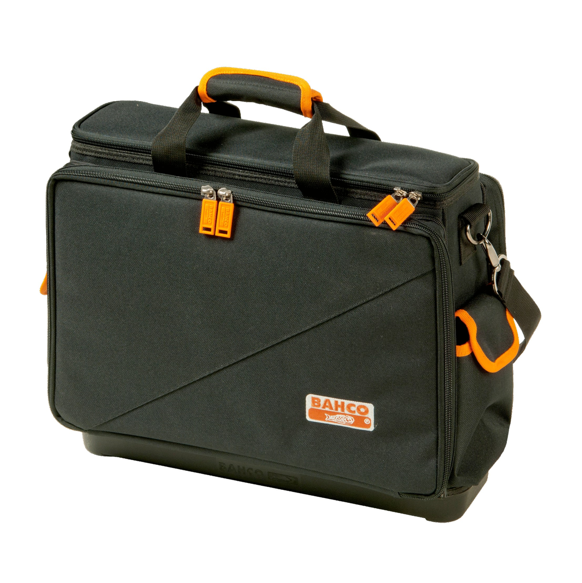 Grande compartimento almofadado central para computador portátil e material delicado semelhante|Seções laterais destacáveis com diferentes bolsas para ferramentas|Combinação de tecidos de poliéster Denier 600 e 1680|Fundo em PP rígido para isolamento e limpeza fácil|Fechos sobremoldados em PVC para fácil manuseamento, mesmo com luvas|Alça para ombro almofadada com ajuste de clique|Seção de suporte para fita métrica, cartão e telefone