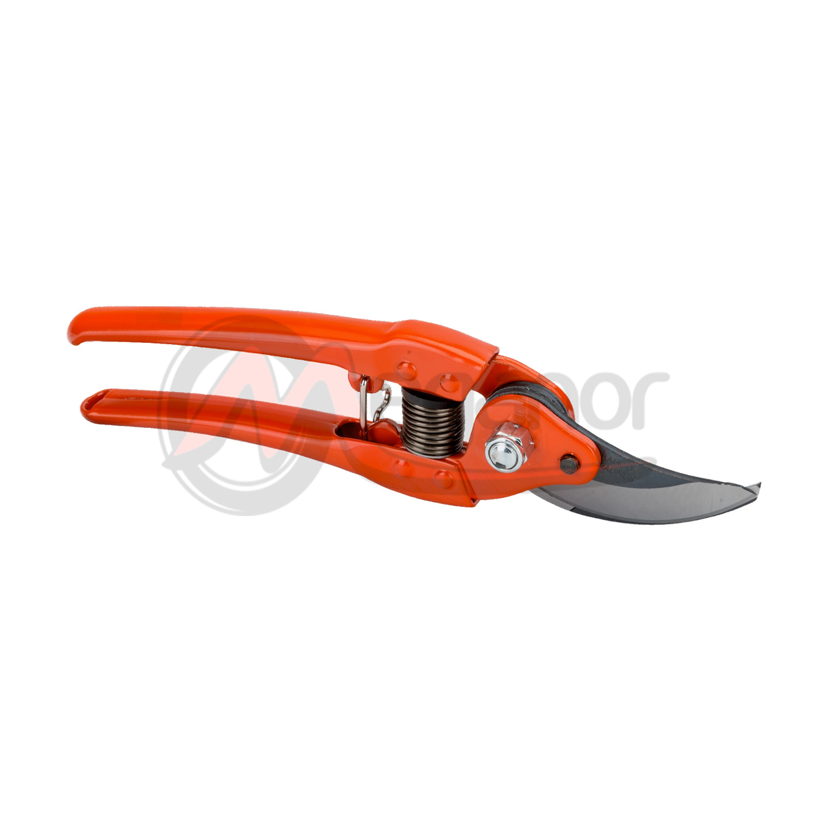 Tesoura profissional de desenho tradicional, para a poda de vinhas e pomares. Punhos em aço estampado. Sistema de fecho com peça de metal, accionado com uma só mão.