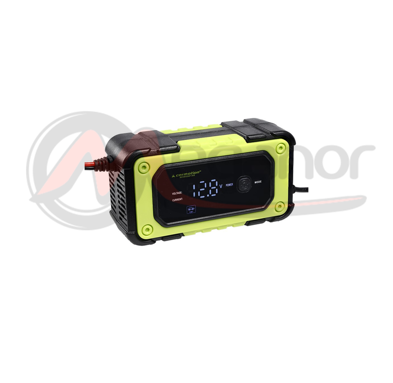 Painel de controle com display LCD retroiluminado/ Fiação com grampos de crocodilo totalmente isolados /Proteção contra superaquecimento, sobrecarga, curto-circuito e polaridade reversa/ Indica o status da carga, parâmetros de carga e conexão incorreta à bateria / Controlado por microprocessador - processo de carregamento multifásico e totalmente automático/ 7 estágios de carregamento / Modo de carga lenta automática/Reconhecimento automático do estado da bateria./ REPARO - Modo de recuperação avançado para reparar e preservar baterias velhas, não utilizadas, danificadas, estratificadas ou sulfatadas. Nem todas as baterias podem ser recicladas, use apenas baterias de motocicleta e carro. /ATENÇÃO! Baterias de gel com capacidade abaixo de 16Ah utilizadas em motocicletas e scooters devem ser carregadas utilizando o programa com a motocicleta no display. Carregar com corrente mais alta pode danificar a bateria e causar perigo!