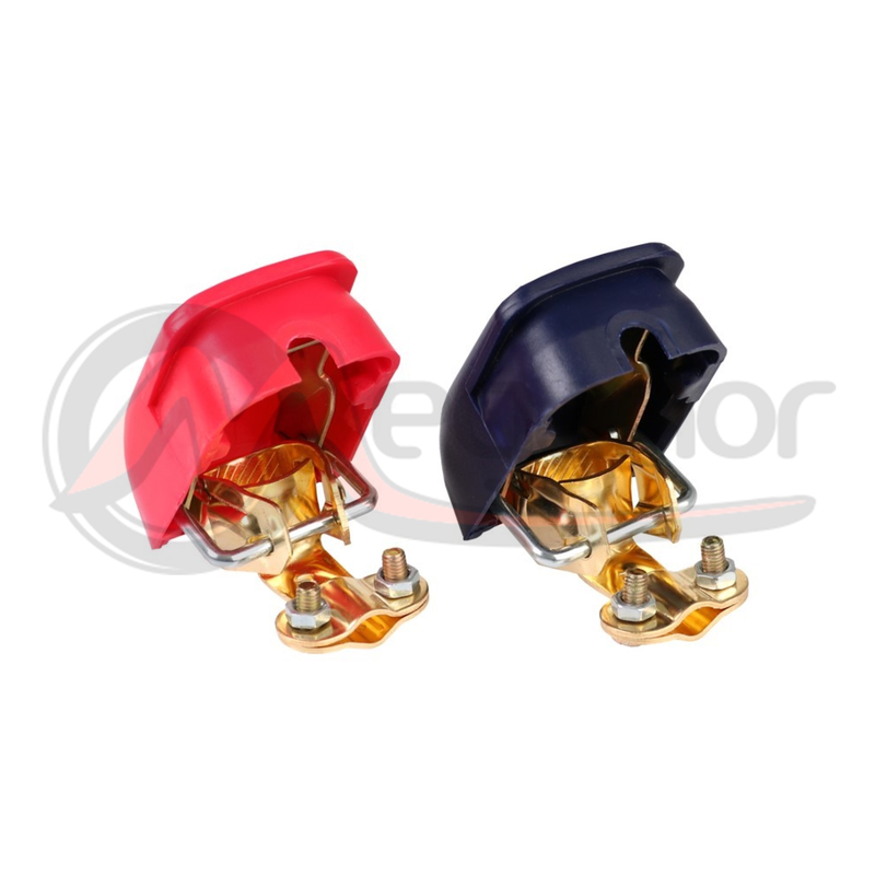 -Grampos de bateria autotravantes com tampas que protegem contra choque elétrico. Fabricado em latão, aço e polipropileno.