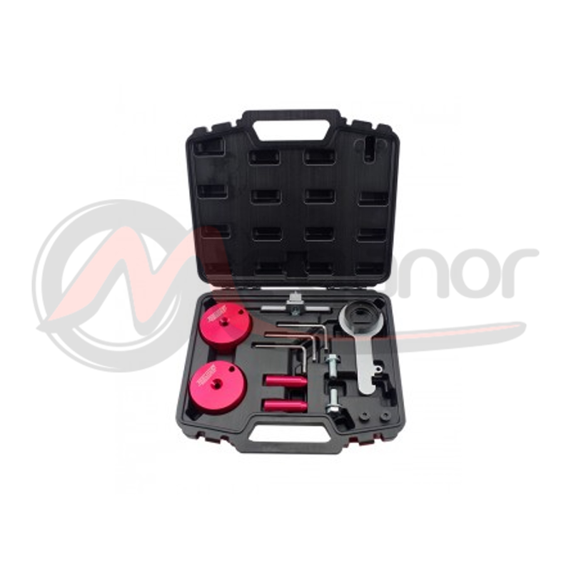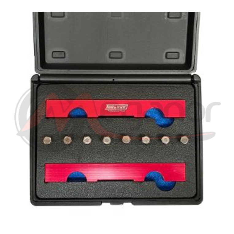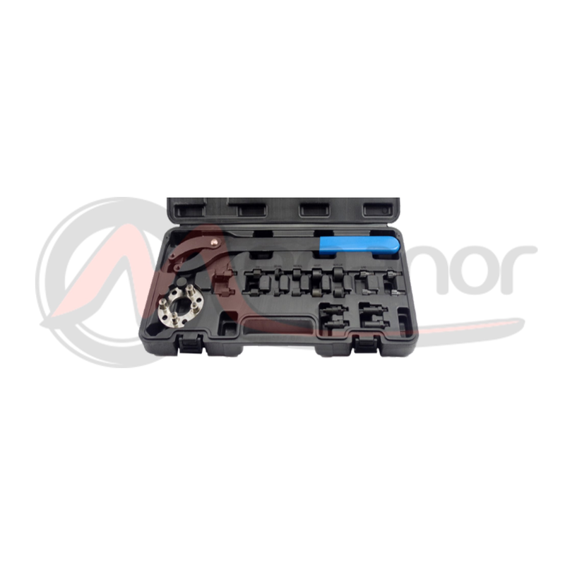 Conjunto completo de ferramentas para fixação de polias e engrenagens em árvores de cames, cambotas, bombas de óleo e bombas de água. Permite travar e segurar as polias para facilitar o aperto e o afrouxamento dos parafusos de fixação. Uma ferramenta essencial com cobertura para toda a gama de motores do Grupo VAG.
