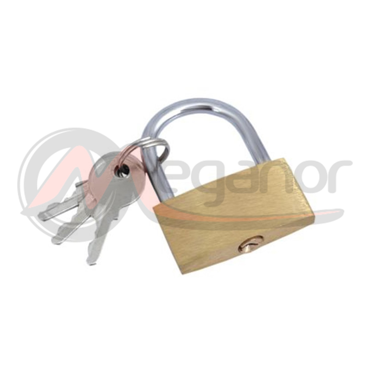 -Um cadeado de latão padrão, usado para proteger grades, postigos, portões, etc.
