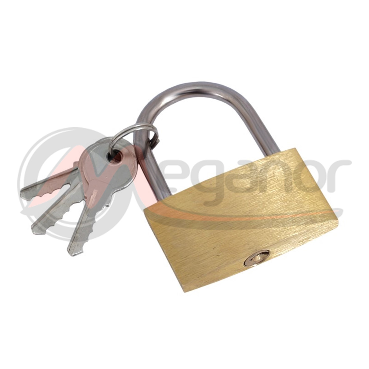 -Um cadeado de latão padrão, usado para proteger grades, postigos, portões, etc.