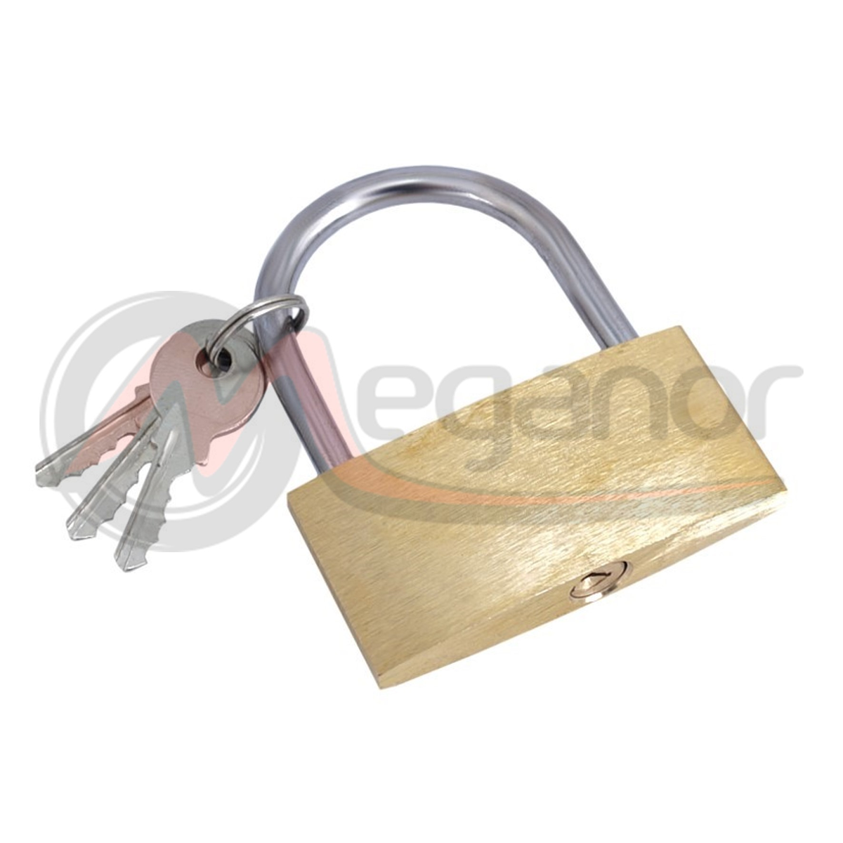 -Um cadeado de latão padrão, usado para proteger grades, postigos, portões, etc.