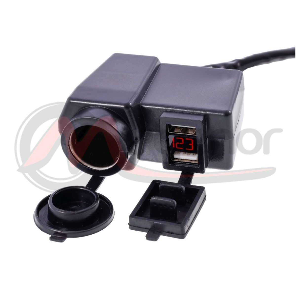 63209 - Tomada de isqueiro à prova d\'água com USB duplo e voltímetro digital. O conjunto inclui suportes para montagem no guidão ou embaixo do espelho. Dados técnicos: DC 12V; 2xUSB; consumo de energia: 4,2A
