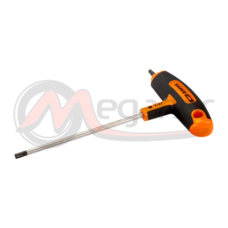 Chave de parafusos com cabo em T para parafusos TORX®|Cabo: o cabo em 2 componentes suave proporciona conforto adicional e reduz o número de pontos de pressão na mão|Lâmina: aço de elevada qualidade. Cromada e inteiramente endurecida. Ponta com acabamento em preto para maior precisão|A lâmina longa permite a aplicação de um torque controlado e proporciona acesso fácil a parafusos em profundidade|A lâmina curta de 90° é utilizada para torque extremo, ou para trabalhos em áreas de altura limitada|Marcação: tamanho e número de peça com marcação a laser na lâmina para fácil identificação