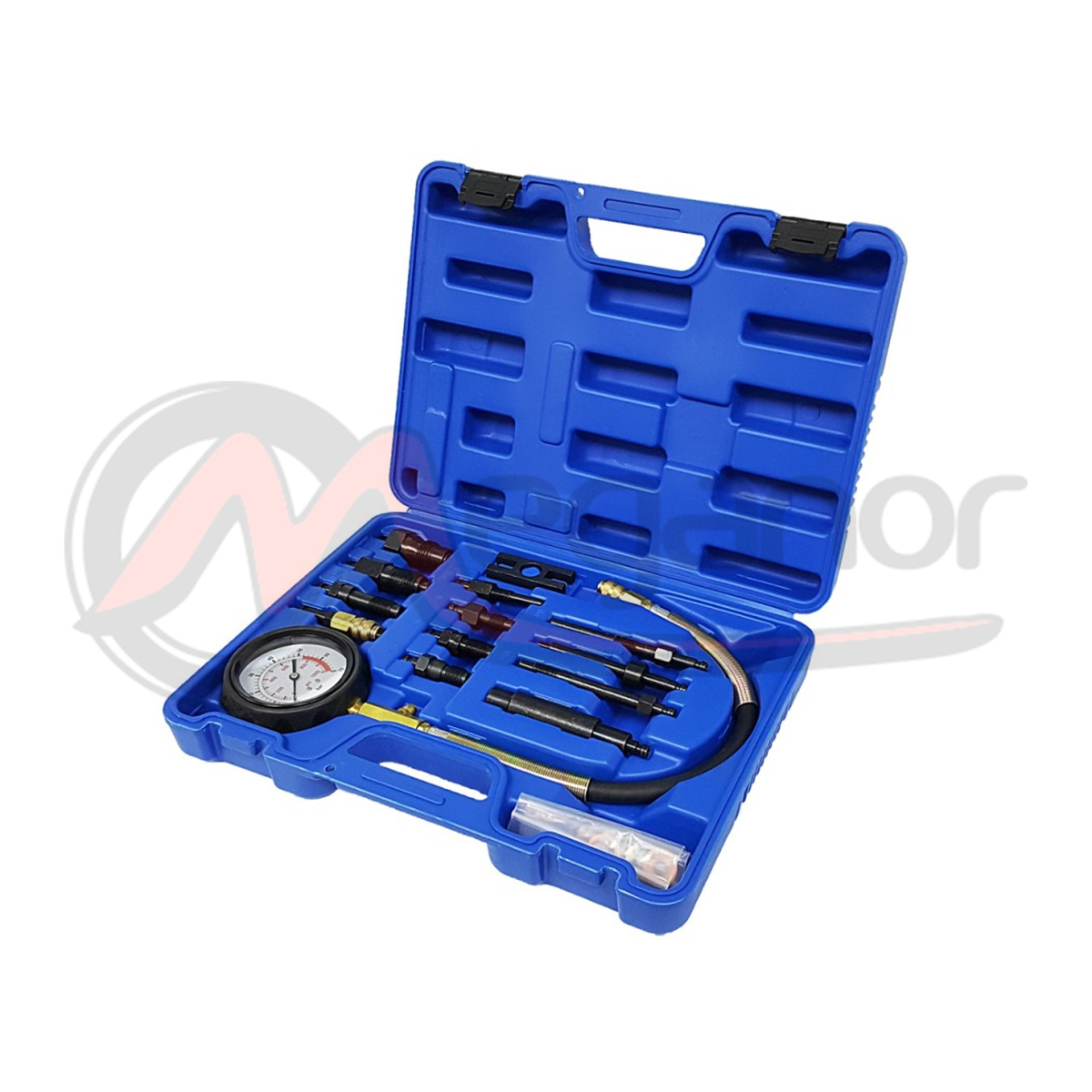 -Kit para medição da compressão de motores diesel. Fornecido em estojo plástico e com os adaptadores mais comuns para medição tanto por velas de incandescência quanto por injetores. O medidor vem com um protetor de borracha.