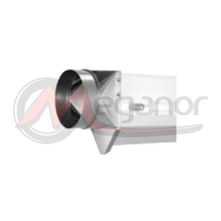 Conexão lateral do trilho ao tubo. Saída lateral para conexão a um tubo de 200 mm de diâmetro.Material: aço inoxidável.