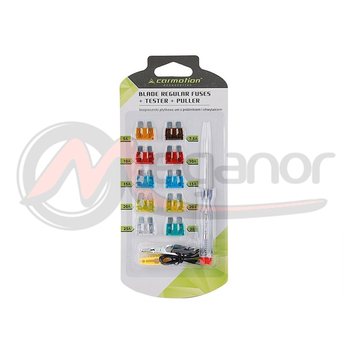 Fusíveis de lâmina feitos de liga de zinco de alta qualidade. Testador universal usado para detectar tensão na faixa de 6-24V. O conjunto inclui uma pinça especial para fusíveis de lâmina. Incluído: