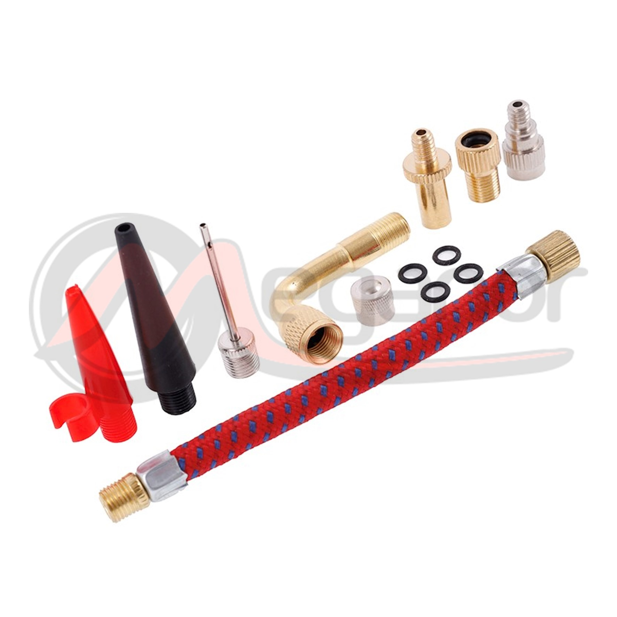 Um conjunto de adaptadores de bombeamento de 12 peças. O conjunto inclui: agulha, vedações, adaptadores , redutores de válvula , extensão de metal flexível , extensão angular tipo Schreder 90 °