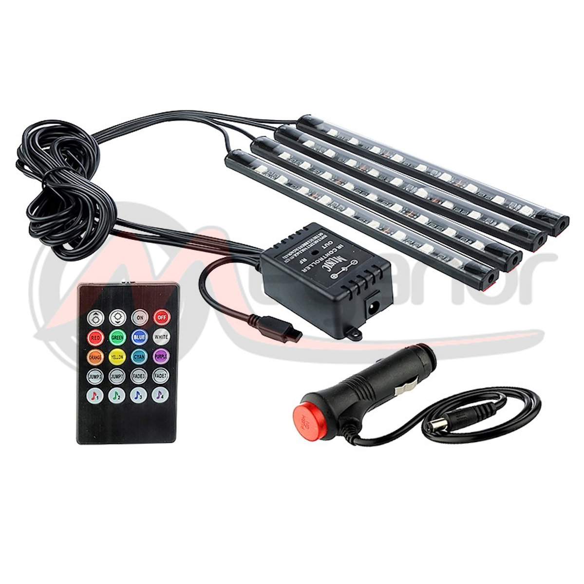 86261 - Faixas de LED à prova d\'água.Alimentado por carregador de carro.Dados técnicos: 4x9 tiras de LED; Fonte de alimentação:12V; 8 cores: vermelho, amarelo, azul, branco, laranja, verde, ciano,roxo; Ajuste de brilho de luz; Tem Controle remoto; 4 tiras de LED; Ficha de isqueiro; Elementos de montagem