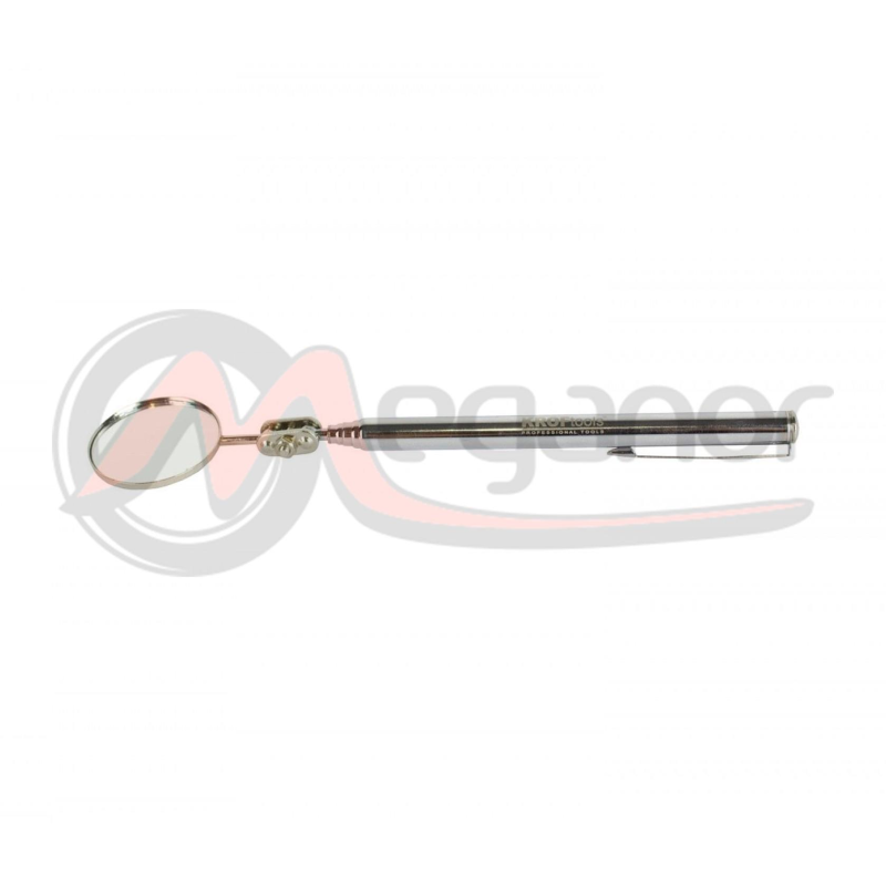 Espelho de Ø50 mm|Comprimento: Em extensão - 450 mm, recolhido e encaixado - 290 mm|Moldura de espelho inoxidável e eixo em aço com proteção de mãos laranja|Cabeça giratória ajustável em todas as direções|Eixo telescópico de duas secções