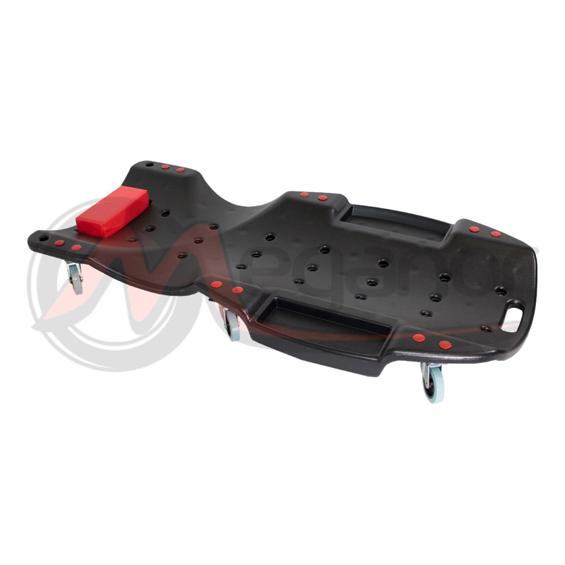 Apoio de cabeça ajustável com três posições|Capacidade: 136 kg|Altura baixa: 120 mm|Bloco de espuma de alta densidade para maior resistência e conforto|Furo para pendurar na parte de trás para fácil armazenamento na garagem|Quatro rodas em PVC, com 75 mm de diâmetro, 25 mm de largura e com rotação a 360°