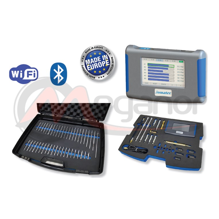 Testador multifuncional capaz de medir diversos parâmetros na oficina automotiva, como pressão, temperatura, compressão, etc., utilizando kits adaptadores opcionais.