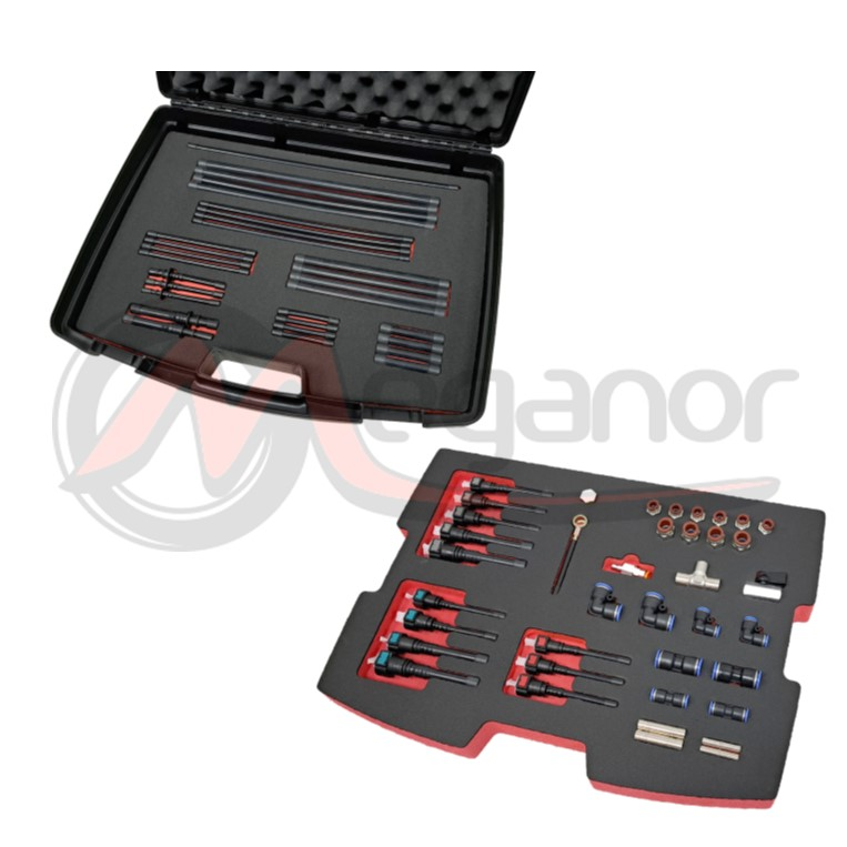Este novo kit de teste de alta pressão para sistemas common rail é utilizado em conjunto com o testador multifuncional e permite um diagnóstico completo do sistema, pois vem equipado com todos os componentes necessários para realizar testes de pressão dinâmica, testes de pressão máxima da bomba, verificação do regulador de pressão e testes de vazamento do injetor. As seguintes peças novas foram incluídas, essenciais para testar motores modernos: