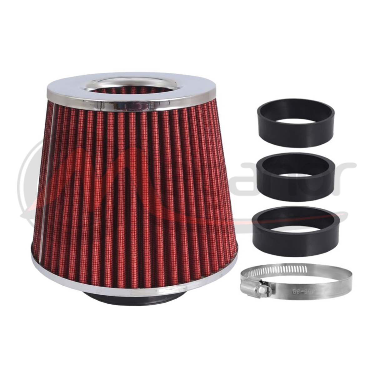Filtro de ar cônico, dimensões 155x130x120mm, confeccionado em algodão, revestido com malha de aço inoxidável. Graças aos adaptadores adicionais, o filtro pode ser adaptado à maioria dos carros.