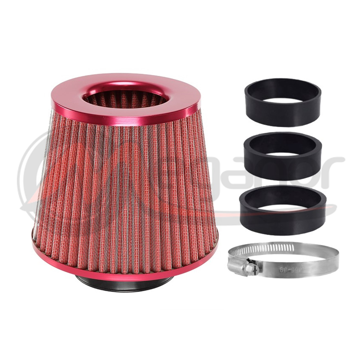 Filtro de ar cônico, dimensões 155x130x120mm, confeccionado em algodão, revestido com malha de aço inoxidável. Graças aos adaptadores adicionais, o filtro pode ser adaptado à maioria dos carros.