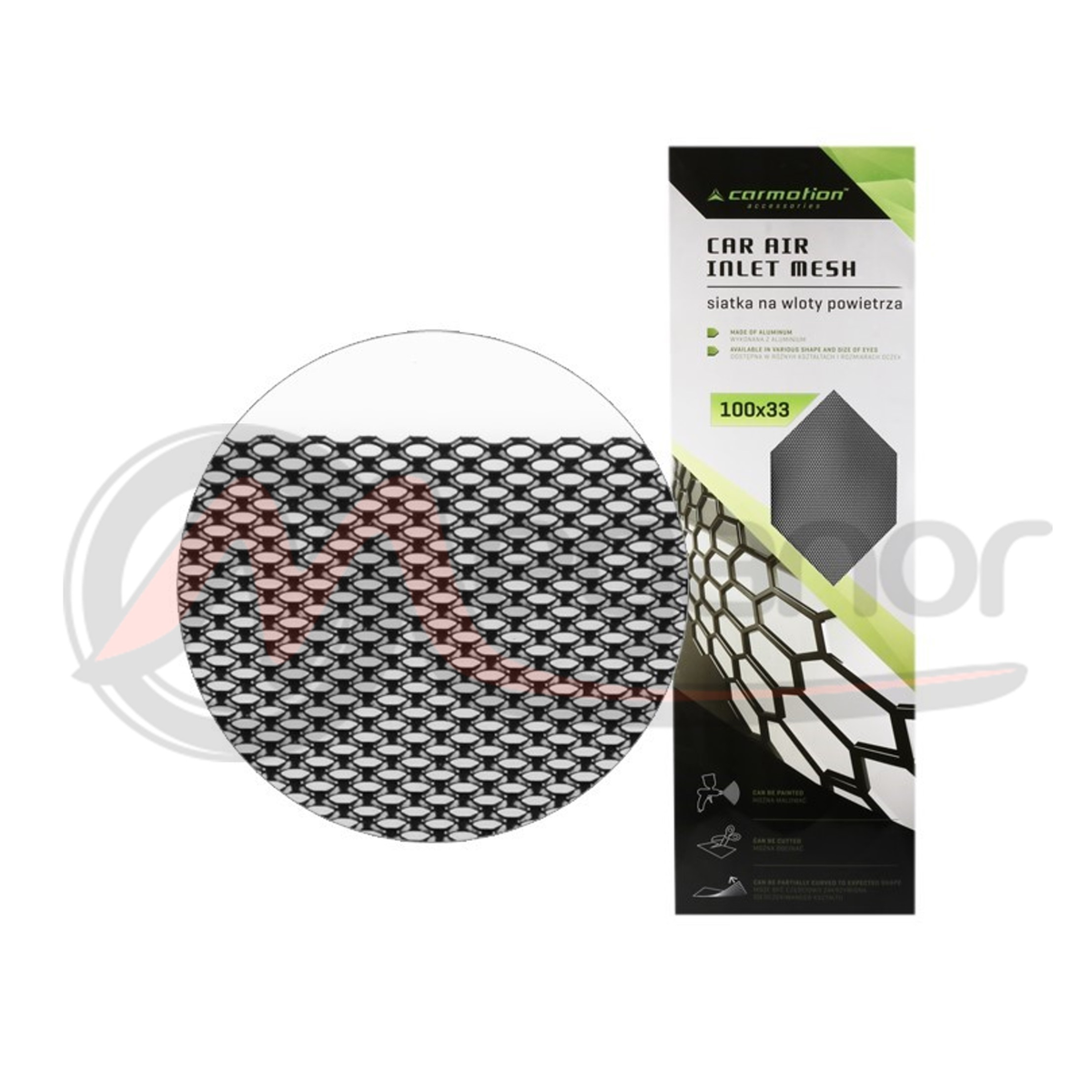 86751 - Grelha em malha de alumínio preto. Ideal para instalação na frente do carro. Isso dará a cada carro um caráter mais agressivo e de design. Grelha de malha em forma de favo de mel com dimensões de 2x4 mm. Dimensões da folha: 100x33 cm