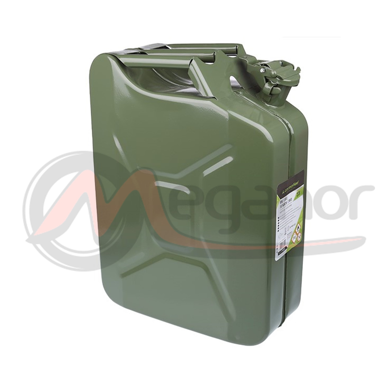 Jerrycan é feito de uma folha de metal com revestimento externo. Isso garante longa vida útil e resistência à ferrugem. Está equipado com um pino que protege contra a abertura por crianças. O Jerrycan foi concebido para o armazenamento/transporte de líquidos (gasolina, gasóleo). Também funciona bem para armazenar combustível, por exemplo, para cortadores de grama, serras a gasolina ou limpa-neves a gasolina.