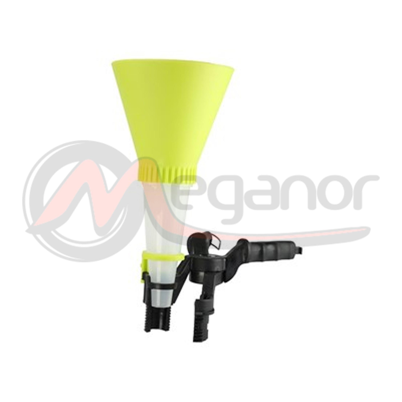 Funil com alça embutida para uso confortável. Fabricado em nylon e PP, resistente a fluidos operacionais. A alça de montagem se ajusta automaticamente ao diâmetro do orifício de enchimento, eliminando a necessidade de segurar o funil na mão. A câmara inferior transparente do funil permite um controle preciso durante o vazamento.