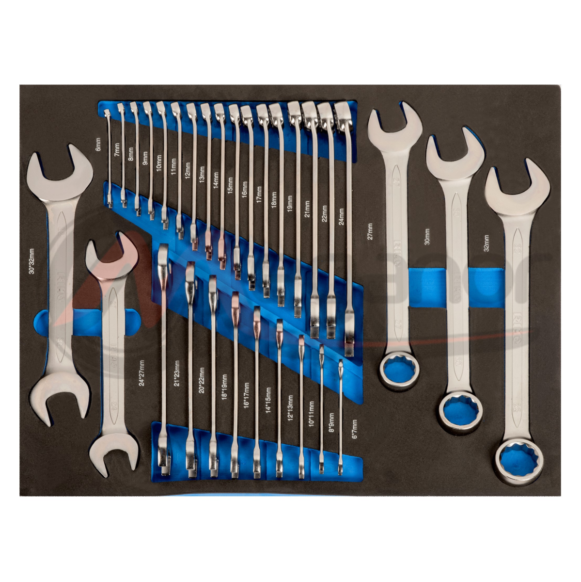 3/3 espuma com ferramentas - 31 peças Composição: Chaves combinadas e de boca dupla - Chaves combinadas: 6 a 32 mm - Chaves de boca duplas: 6-7 a 30-32