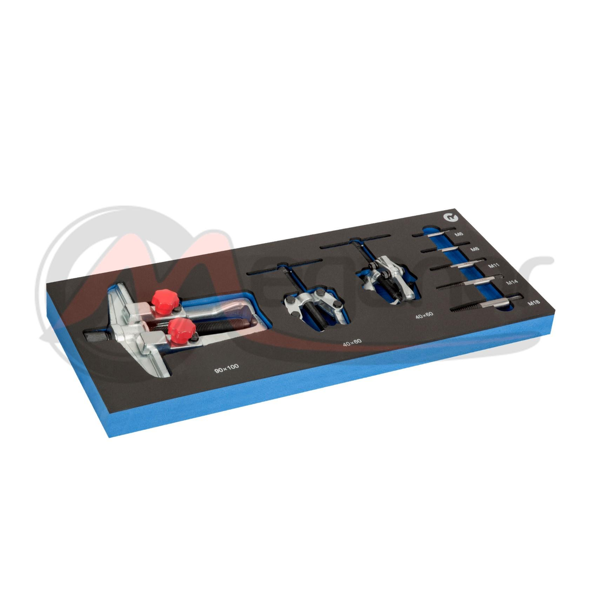 Inclui extrator de 2 braços universal de ajuste rápido 90x100, extrator de 2 braços autocentrantes 40x60, extrator de 3 braços autocentrantes 40x60 e conjunto extrator de pinos 5 peças, M3-M18