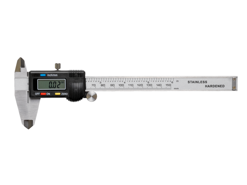 Paquímetro digitalPrecisão ±0,03 mmFeito de aço inoxidável temperadoInclui gráfico de tópicosEm caixa de plástico para armazenamento seguro