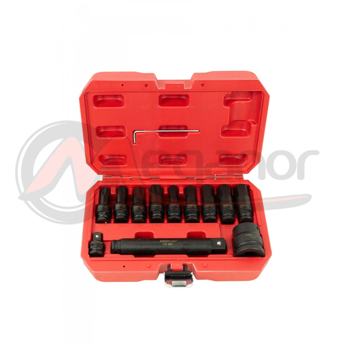 BitsHexagonal - 14mm, 17mm, 19mm, 21mm, 22mm- 5xBits Torx - T70, T80, T90, T100- 4xAumento de impacto 3/4\" x 200mm- 1xAdaptador de impacto 3/4\" x 1/2\"- 1xAdaptador de impacto 3/4\" (Bloqueio)- 1x