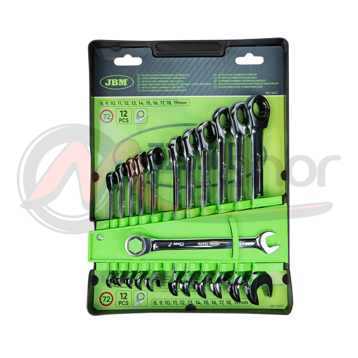 Conjunto de 12 chaves. Cada chave combina dois tipos de cabeçotes: um fixo e outro com catraca, permitindo alternar entre os modos conforme as necessidades do trabalho.