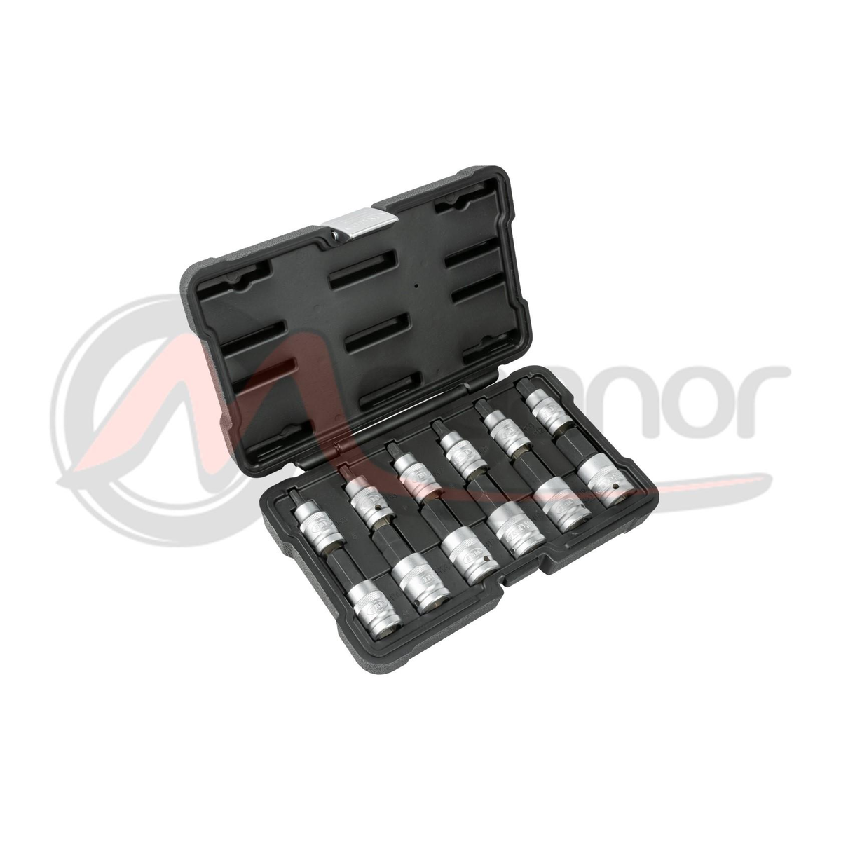A caixa de ferramentas contém:Ponta hexagonal 1/2\"· 55 mm: H5, H6, H7, H8, H10, H12· 65 mm: H14· 70 mm: H16, H17, H18, H19, H22