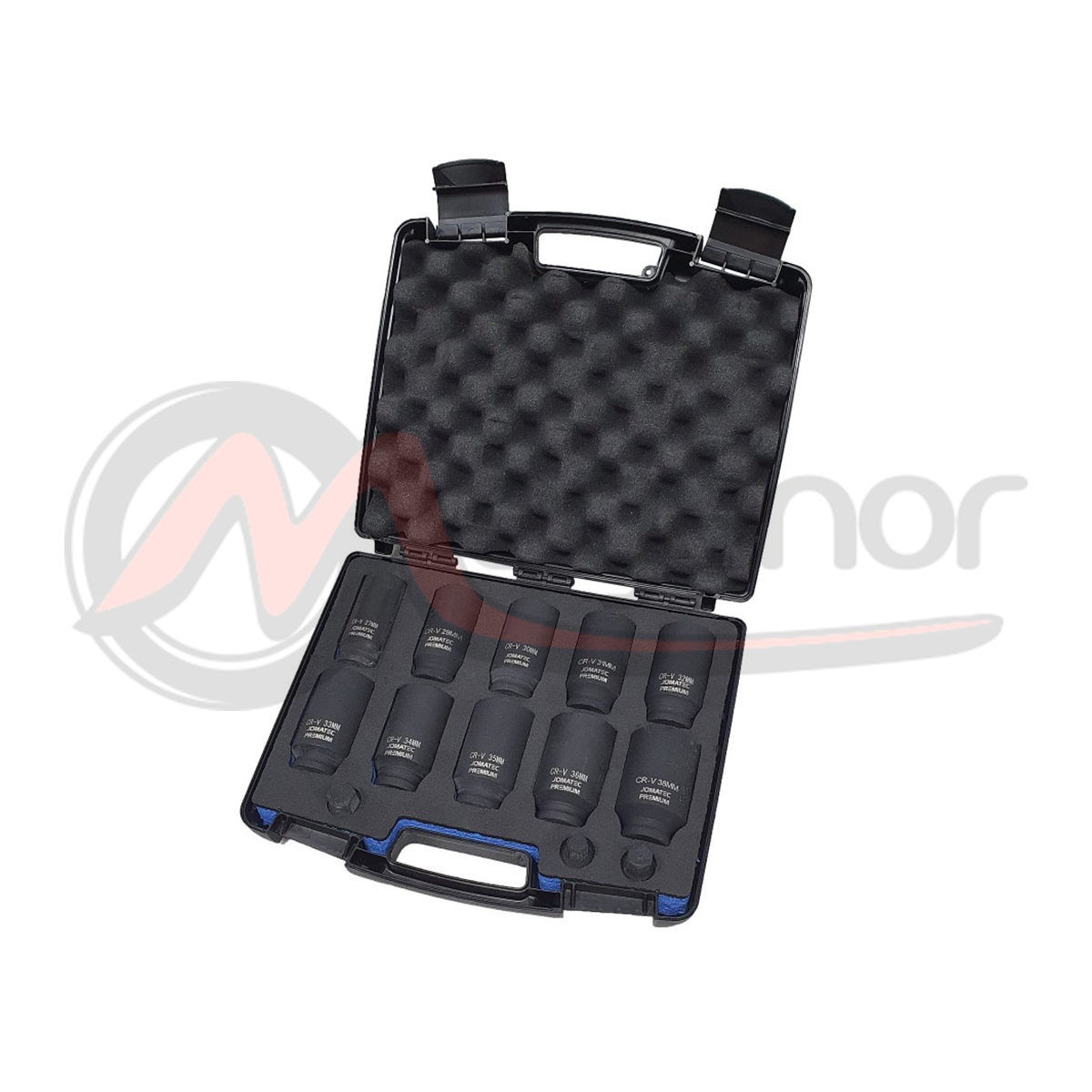-Conjunto de soquetes de impacto de 12 lados da série Long, especialmente projetado para uso na montagem e desmontagem de eixos cardan. Este conjunto contém 10 soquetes com as medidas mais comuns e três brocas Allen de impacto.