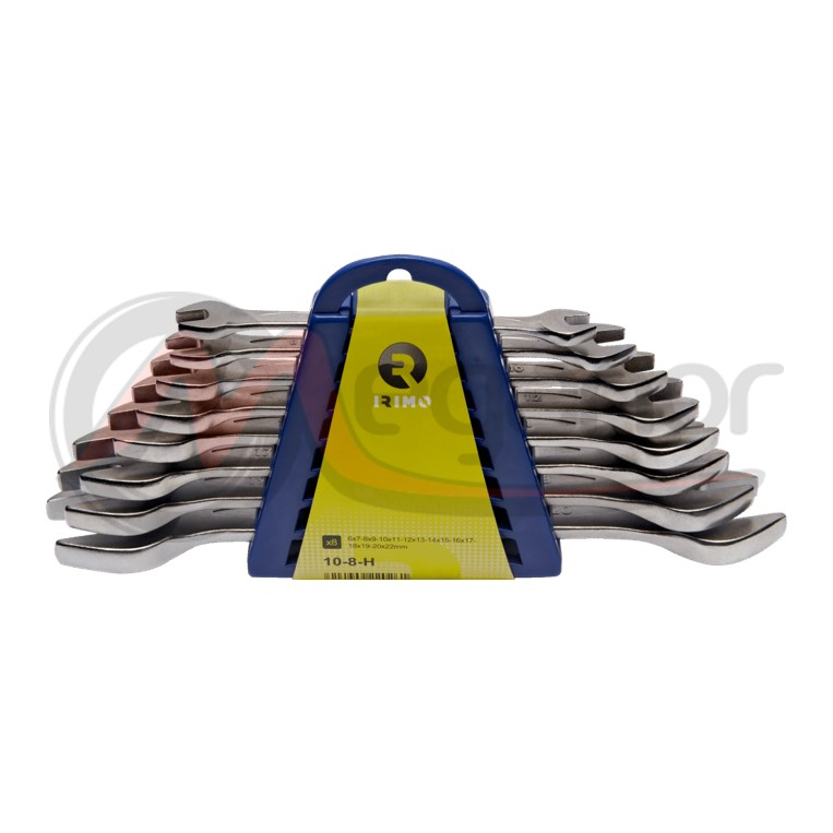 Conjunto de 8 peças em suporte plástico Composição: Chaves de boca abertas de 6x7 a 20x22 Acabamento: Acabamento cromado mate Material: Liga de aço de alto desempenho Dureza: 42-50 HRc Normas: ISO 10102