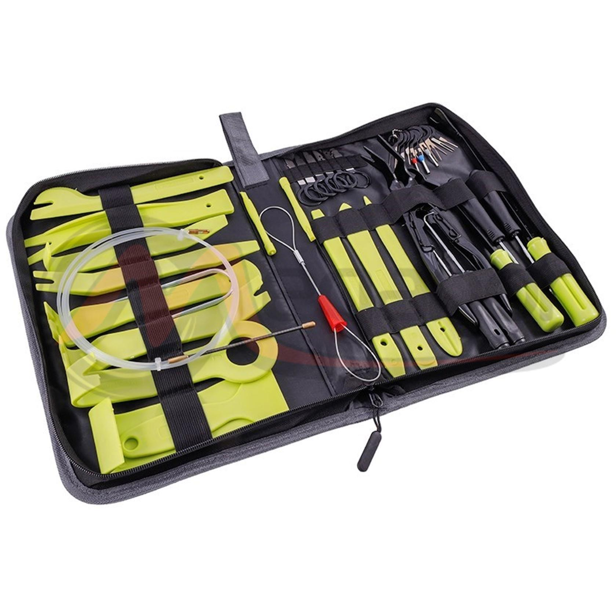 O conjunto inclui removedores universais que permitem desmontar com eficiência rádios, telas, navegações, etc. sem danificar o estofamento.