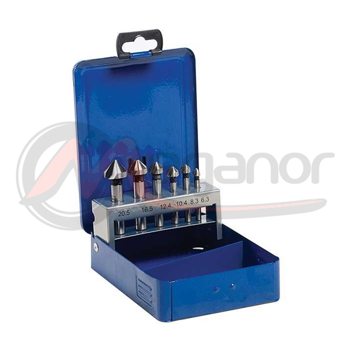 Composição6 Escareadores em caixa metálica: 6,3 / 8,3 / 10,4 / 12,4 / 16,5 / 20,5mm